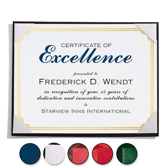 Because they are less bulky than glass and wood frames, leatherette boards are perfect for smaller spaces. They look excellent propped up on a bookshelf, a mantle, or the corner of a desk. You can even create a cohesive look by using matching boards to display certificates, awards, and a graduation photo alongside the diploma.