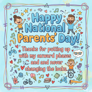 You might write something playful, like: “Happy National Parents’ Day! Thanks for putting up with my awkward phases and never changing the locks.” Alternatively, try: “I love how we don’t even need to say out loud that I’m your favorite child.”